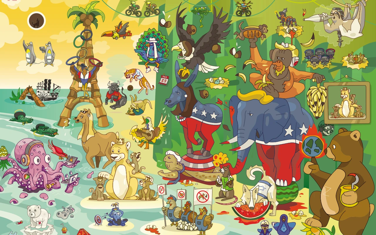 2024 was een wervelwind. Ik probeerde om zoveel mogelijk referenties uit in een samenhangend beeld te verwerken. Zo is Joost Klein uit een boom gevallen, kwam Trump terug aan de macht en kroont Simon Biles zich de grote winnaar van de Olympische Spelen. Het jungle thema werd opgebouwd vanuit de quote van Kamala Harris "You think you just fell out of a coconut tree?" als referentie naar hoe heel de wereld wegkijkt van de gruwel. En vooral hoe we ondertussen die kleine ijsbeer vergeten die het klimaat symboliseert. De wereld is een jungle, waar de wet van diegene die het luidste roept soms te veel aandacht krijgt.